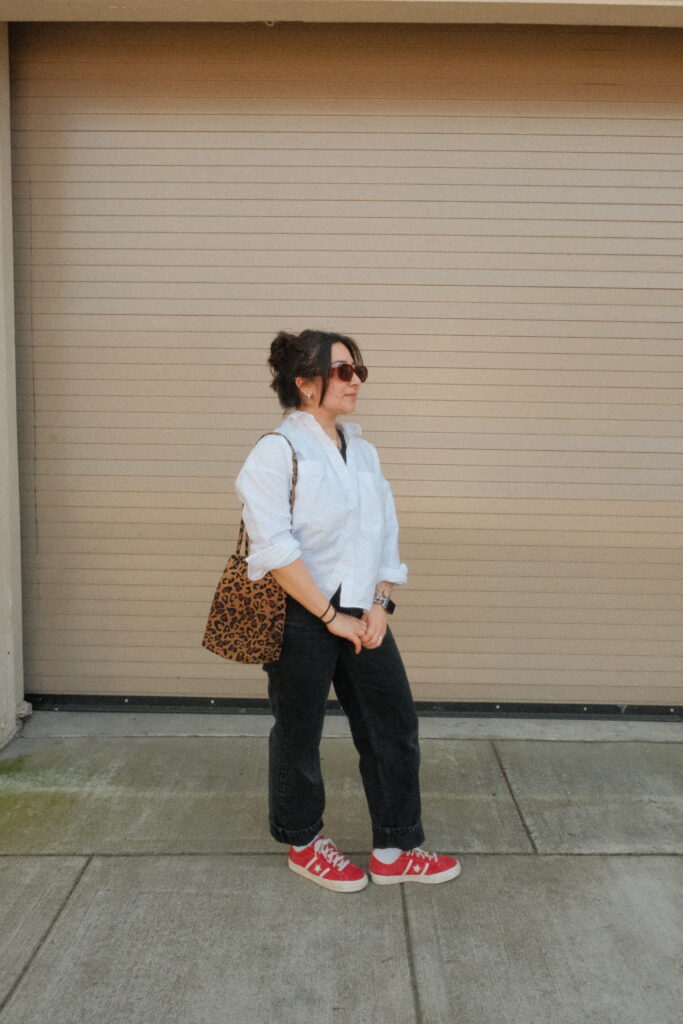 Karli on April 5th Apr. 05, 2025 / Outfits What’s Secondhand? Vintage Levi’s & Cheetah print purse from Hollywood Vintage The Rest of It Sunny’s from Amazon, Button up shirt from Everlane, and Red CONS One Star Academy Pro from Converse